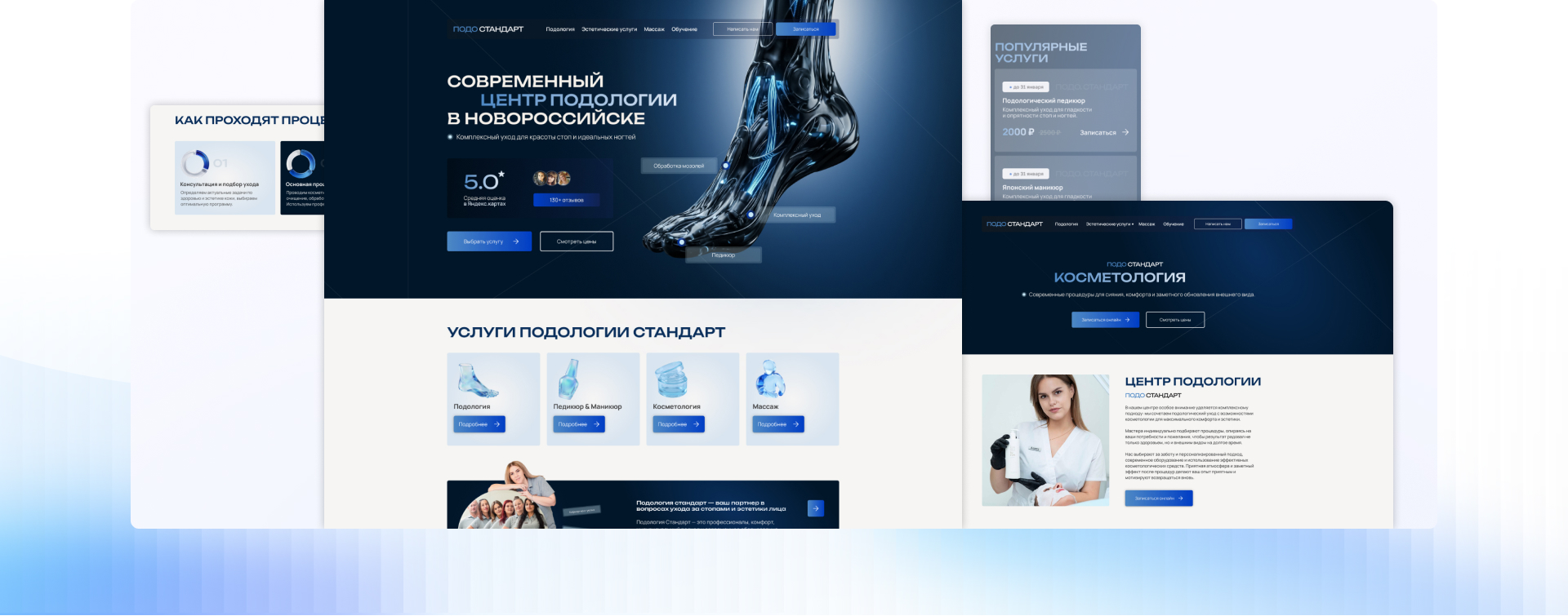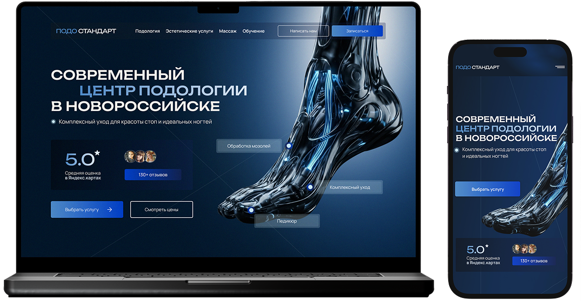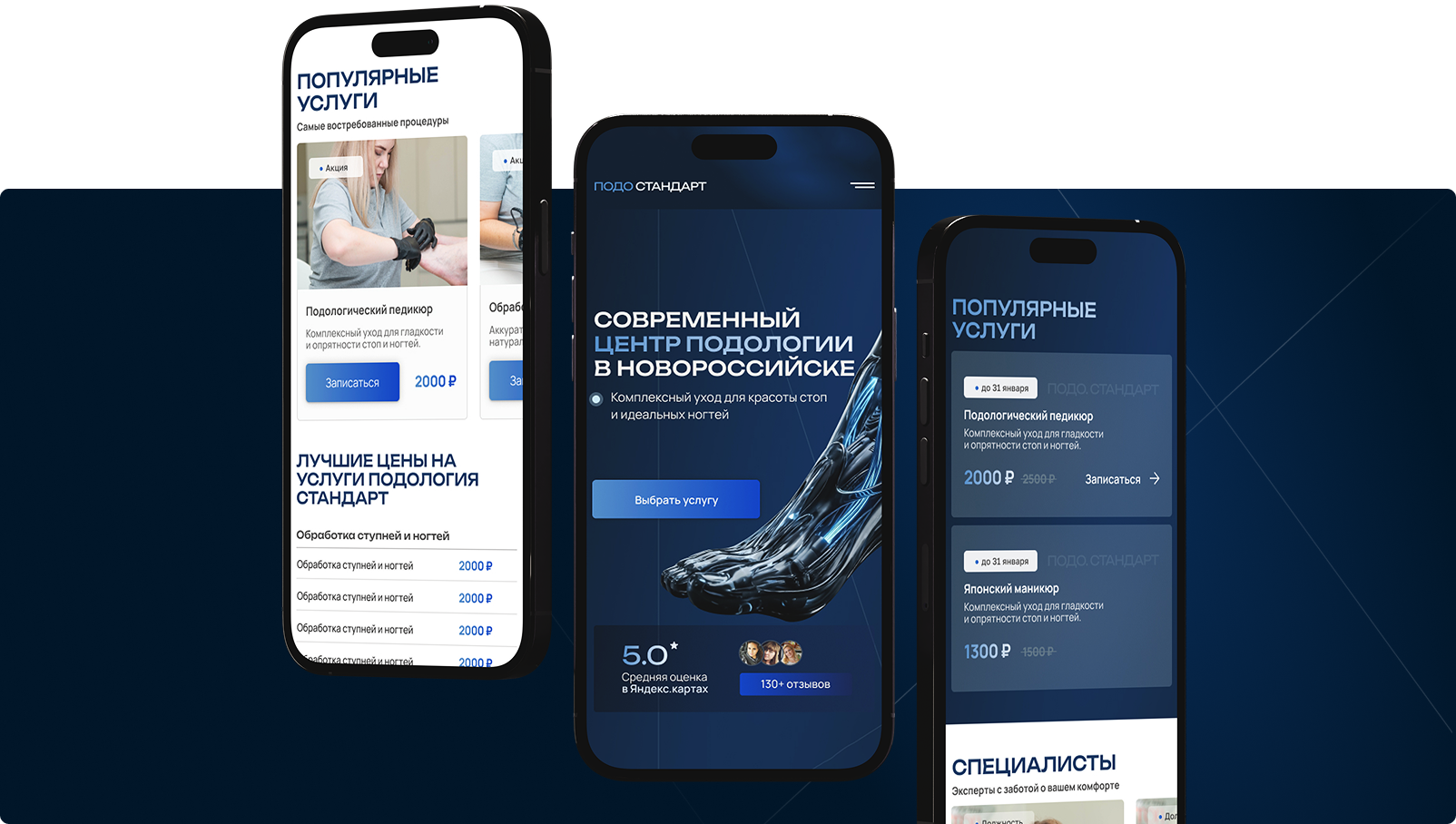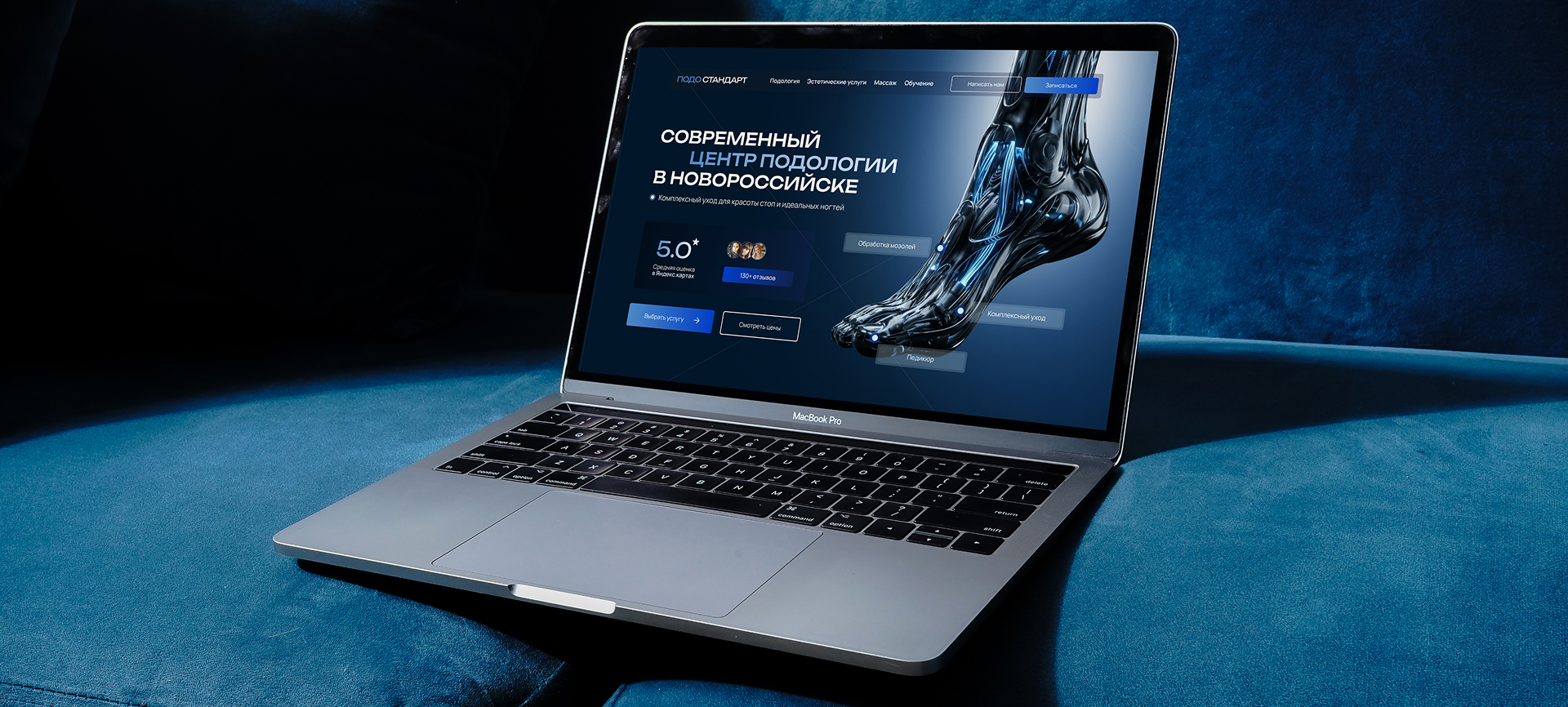 Подология Стандарт — центр современной подологии в Новороссийске. Клиент столкнулся с комплексом проблем: сайт не приводил клиентов, не было единой системы записи, визуальный стиль «рассыпался» между сайтом, картами и соцсетями, а рекламные каналы не были задействованы.