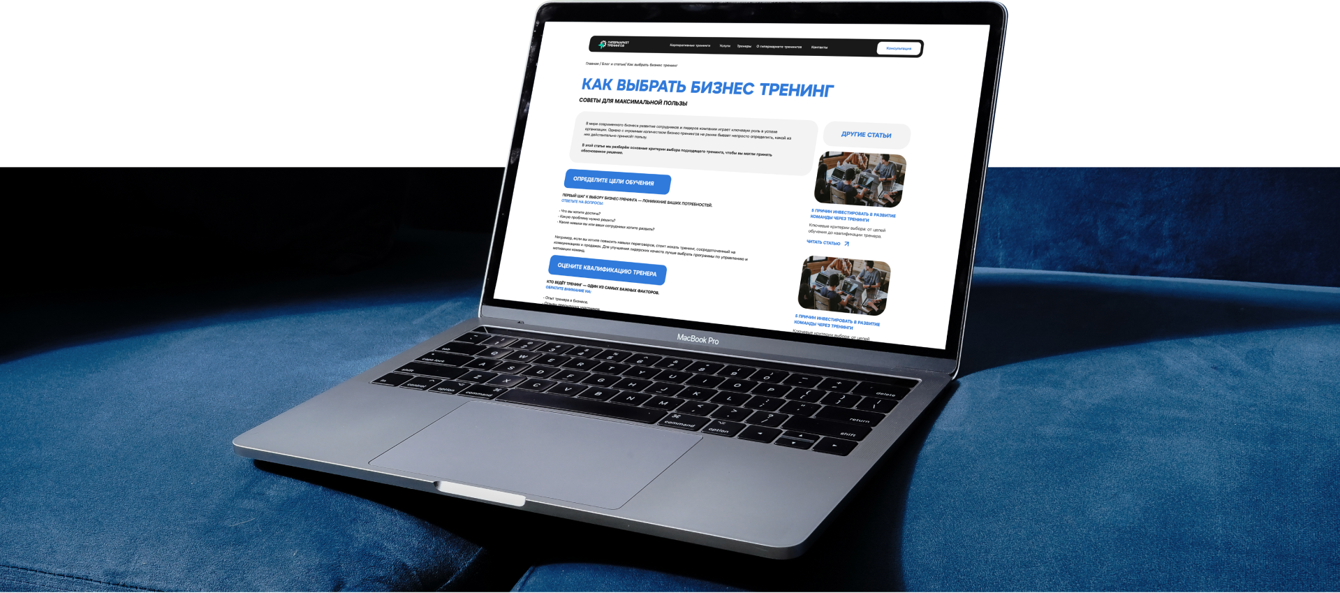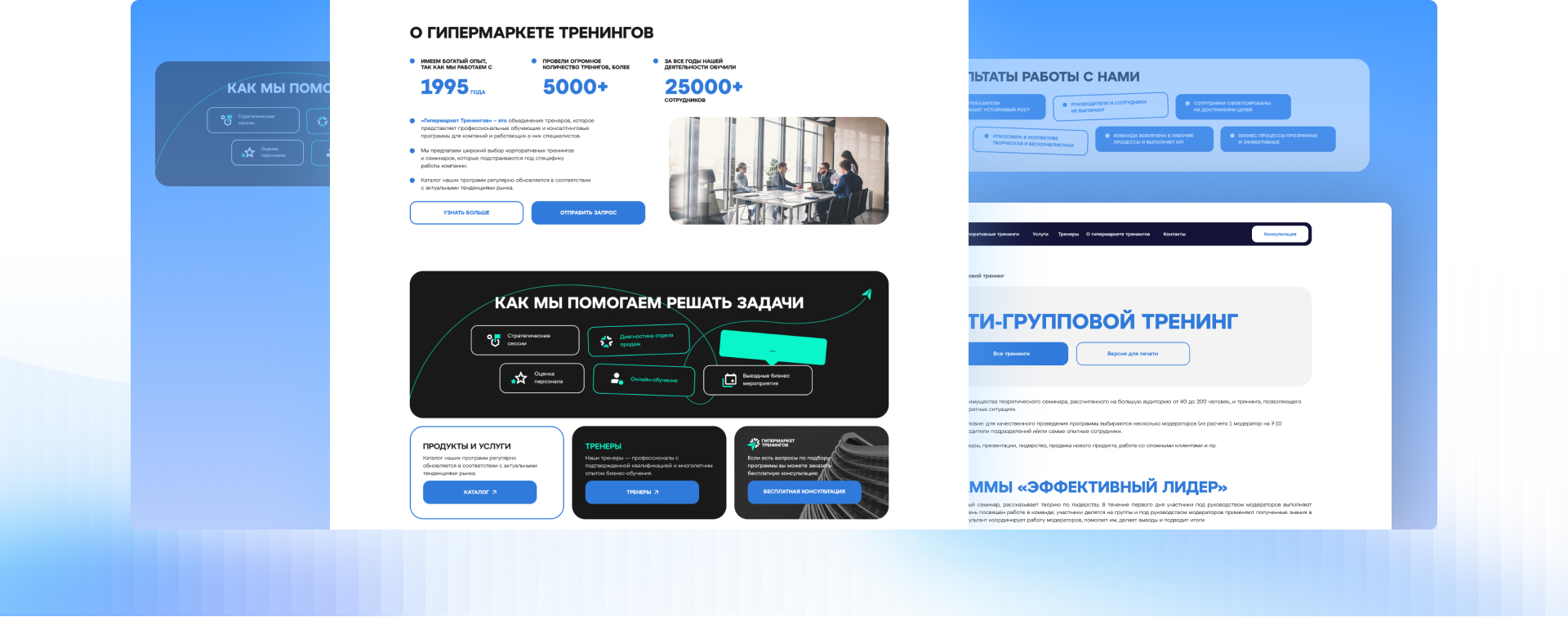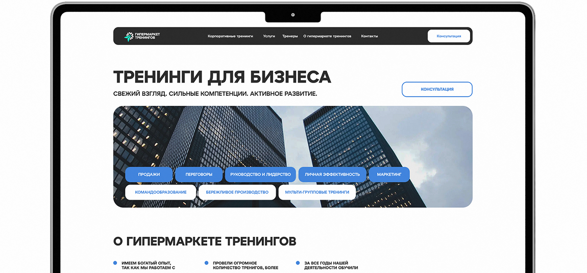 Гипермаркет бизнес-тренингов — платформа, объединяющая обучающие программы для компаний и специалистов. Клиент обратился к нам с задачей: повысить количество обращений и сделать выбор программы прозрачным и удобным для пользователя. Было важно не просто обновить сайт, а выстроить систему, которая приводит заявки, повысить узнаваемость и доверие к платформе.